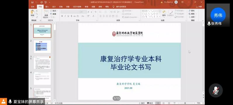 针对教育康复学专业学生,王姣艳老师从毕业论文的规范要求、进程安排、质量提升和材料归档四个方面展开,以学校毕业论文管理规范办法为参照,结合往届毕业论文常出现的问题,对毕业论文的选题、开题报告、中期检查、论文答辩,尤其是论文的结构,研究方法、研究结果和讨论等部分撰写的注意事项、格式问题等进行讲解,并提供示例。