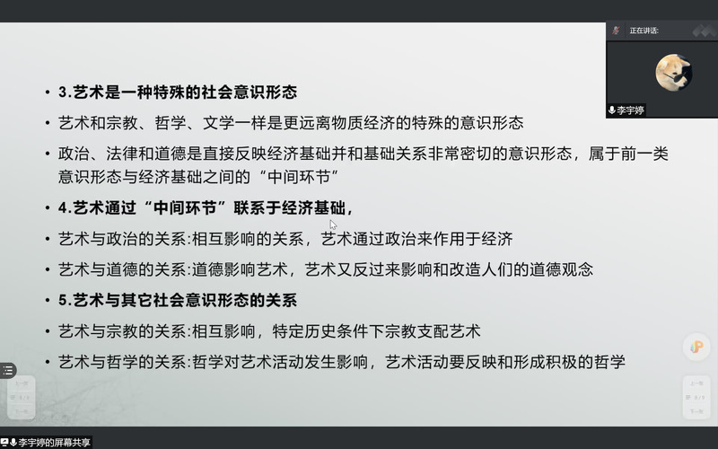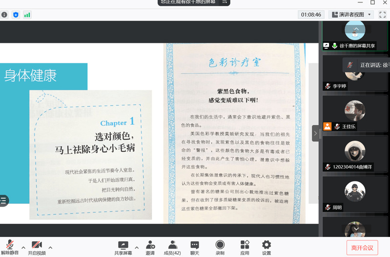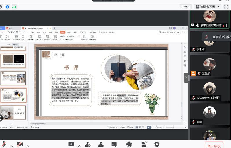戚思敏同学分享了《了不起的中国画》,从书的核心内容展开介绍,图文并茂,内容详实。徐景钰同学分享的《谈美》从自然美到艺术美的分析每一处都有自己的感悟。邵仪菲同学则从作者简介、内容介绍、学习原因以及个人感悟这四个方面为我们讲解了《中国工艺美术史》这本书。王佳乐同学详细地为大家介绍了《艺术何为》这本书,不论是从精神上还是内容上都有着自己的独到见解。秦焕杰同学从《现代艺术150年》中提取了部分精彩片段为大家讲解了推荐这本书的理由。王洋同学则从绘画、建筑、雕塑等方面为大家介绍了《艺术的故事》这本书。徐千惠同学推荐的《你信什么,色彩告诉你》则是一本比较有新意的书,从这本书中徐千惠同学还介绍了自己学习、努力的方向以及感悟。最后一位李宇婷同学则介绍了一本理论性较强对于考研有所帮助的书籍——《艺术概论》。