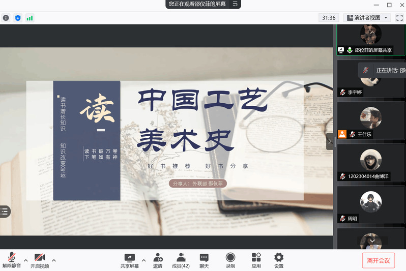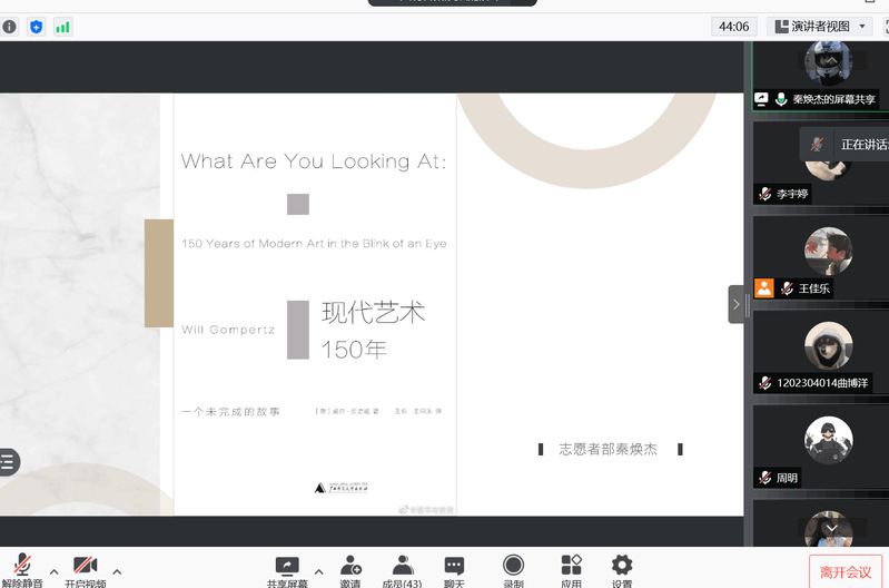 为培养同学们良好的阅读兴趣,营造浓郁的校园文化氛围,9月28日晚8时,美术与设计学院在线召开“阳光读书讲坛”第四期读书分享会。党总支副书记丁宝龙老师、团总支副书记朱思思老师及部分学生参加了此次读书分享会。此次会议邀请到了美术学教授陈新老师作为主讲人。
