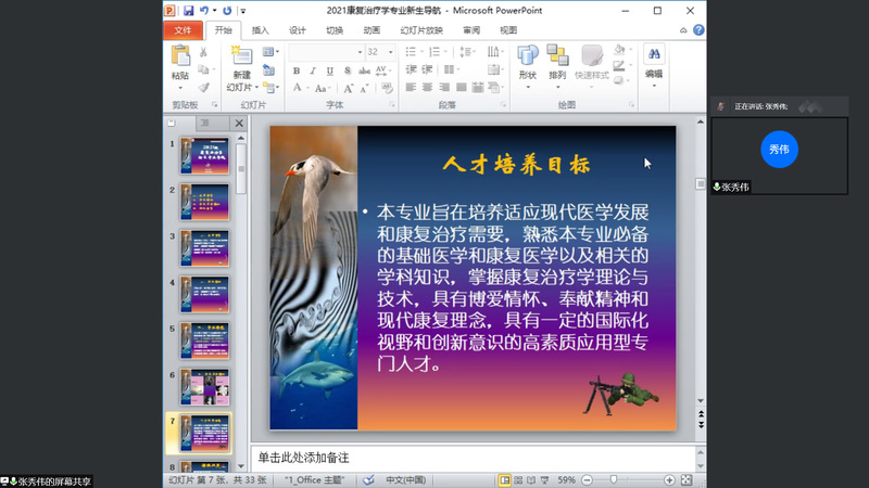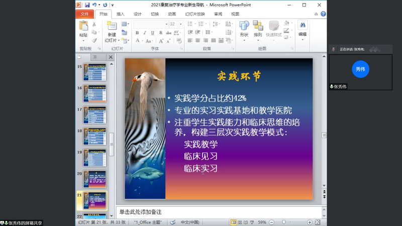 为了帮助2021新生更好的适应专业课学习,更快的融入大学生活,康复科学学院于10月16日上午通过腾讯会议,举办新生专业介绍及入学导航教育大会。康复医学系主任张秀伟、教育康复系主任许海燕、2021级新生辅导员、新生班主任、全体副班及全体新生参加专业导航教育。