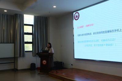 朱玉飞老师阐述了高校辅导员思政工作的特点、要点及创新点。并结合自身工作经验,分享了大学生突发事件应急与处置的基本知识,从类型与构成、性质及诱因划分都做了解析,并结合图表详细介绍了突发事件应急处置的流程。最后倡议辅导员要始终贯彻牢记安全底线工作原则,坚持日常教育管理不放松,通过提高工作质量,创新工作方法,有效预防与降低校园突发事件的发生。
