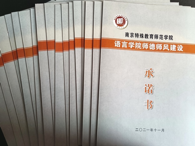 会后,学院组织全体老师签订《语言学院师德师风建设承诺书》,要求作为一名高校教师,恪守教师职业道德,严格遵守《高等学校教师职业道德规范》《新时代高校教师职业行为十项准则》,做到坚定政治方向、自觉爱国守法、传播优秀文化、潜心教书育人、关心爱护学生、坚持言行雅正、遵守学术规范、秉持公平诚信、坚守廉洁自律、积极奉献社会。老师们仔细研读承诺书内容,郑重签下名字。大家表示,将牢记教师使命,潜心育人,教学相长。