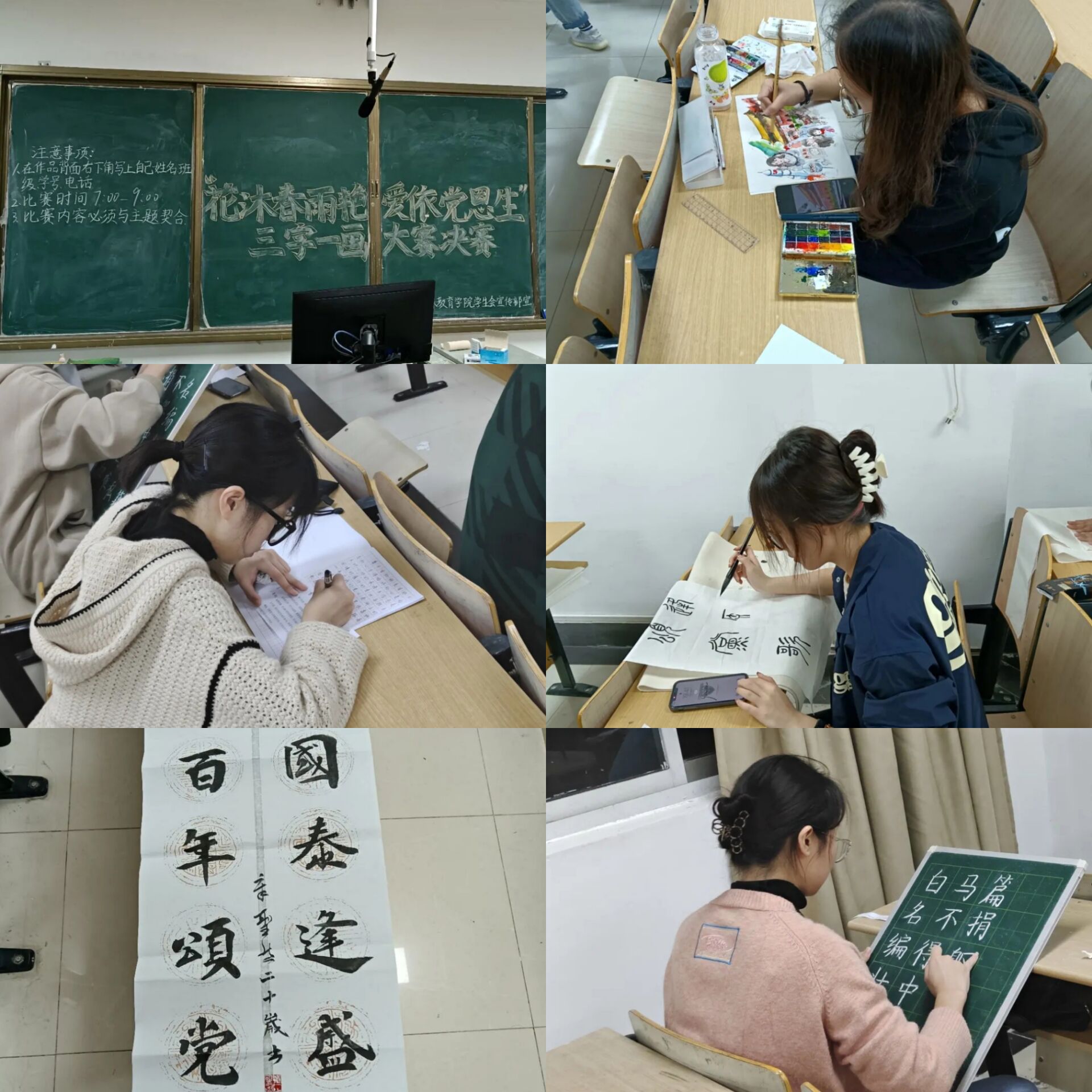为庆祝中国共产党百年华诞,提升师范生“三字一画”基本技能,特殊教育学院于11月举办“花沐春雨艳,爱依党恩生”绘写大赛。绘写大赛分为初赛、复赛、优秀作品展三个环节,包含简笔画、钢笔字、毛笔字、粉笔字四个项目。