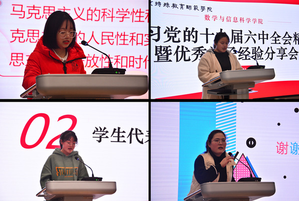 学生党员王苏徽带领大家学习了党的第十九届六中全会精神,在深入学习党的百年奋斗重大成就和历史经验的同时,结合自身实际,表示要以更高的标准严格要求自己,坚定理想信念,扎实学好知识,为实现第二个百年奋斗目标、实现中华民族伟大复兴的中国梦而不懈奋斗。学生代表袁首博、牛丽萍从新生角度出发,就学习内容进行了交流发言。