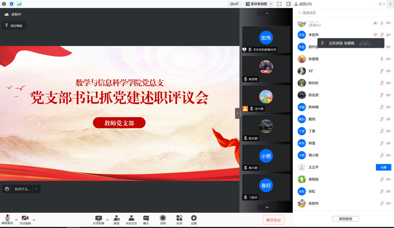 12月26日上午,数学与信息科学学院教师党支部召开党支部书记抓党建述职评议会,会议以线上形式召开。会议由教师党支部书记张居晓主持,学院教师党支部全体党员,数学与信息科学学院党总支全体委员全程参会。