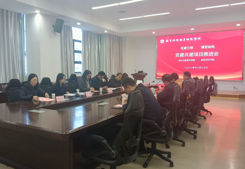 为深入贯彻落实十九届六中全会精神,探索新形势下基层党组织建设新模式,实现博爱助残的美好愿景,2021年12月30日,康复科学学院与南京市栖霞区残疾人联合会(以下简称“栖霞区残联”)党建共建合作项目促进会在校召开。栖霞区残联黄伟理事长、王燕江副理事长一行六人,校党委常委姜玉泉副校长、组织部张金福部长、康复科学学院王姣艳副院长、美术与设计学院薛皓洁副书记以及康复科学学院党员教师代表出席此次会议。会议由康复科学学院党总支副书记吴填主持。