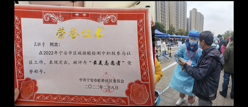 “社会是一个大家庭,我们每个人都是大家庭的一员,每个人都有为大家庭服务的义务。”得知自己的社区急需上门上户排查与进行核酸检测的志愿者,20级小学教育专业2007班的关钦予立即报名了社区值班志愿者。这次志愿服务让她在思想认识上有了很大提升,由于服务出色,她还被城区授予“最美志愿者”的荣誉称号,这也让她体会到了为社会做贡献的幸福和快乐。