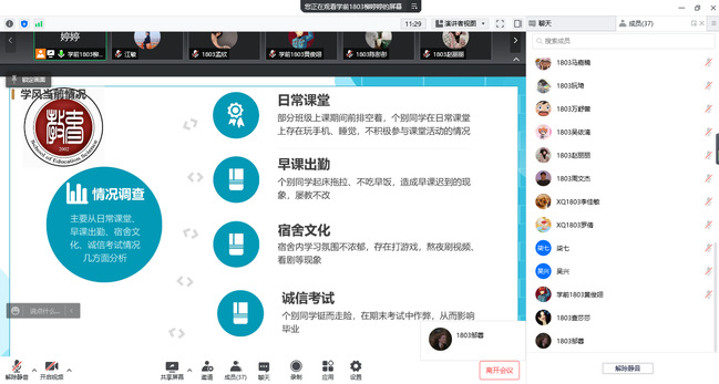 会议从“学风建设意义”“目前现状”“从我做起”“共同努力”四个方面展开。首先,第一部分以“如何读大学?”引出内容,提出大学生要利用好四年大学时光,扎实学好专业知识,只争朝夕,不负韶华!其次,第二部分简要分析了目前大学生学习的基本现状,提醒同学们寻找合适自己的学习方法,养成良好学习习惯,为职业生涯发展做足准备。最后提出,今年是我校本科合格评估重要时期,应从班级做起,从自身做起,抓实、抓牢学风建设。在班会的最后,各班辅导员、班主任老师针对各班实际情况对同学们提出要求,希望大家踔厉奋发,笃行致远,营造优良学风、班风。