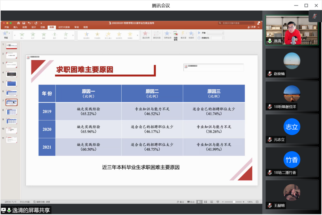 为进一步了解当前就业形势政策,促进疫情期间顺利开展毕业班就业工作,特殊教育学院于3月31日晚在线召开2022届就业工作推进暨安全教育会议。学院党总支书记叶亮、党总支副书记李鹏、毕业班辅导员、毕业班班主任和全体2018级学生参加,学生工作处郭建勇老师和娄文婧老师参会做专题辅导。会议由学工办副主任元志立老师主持。