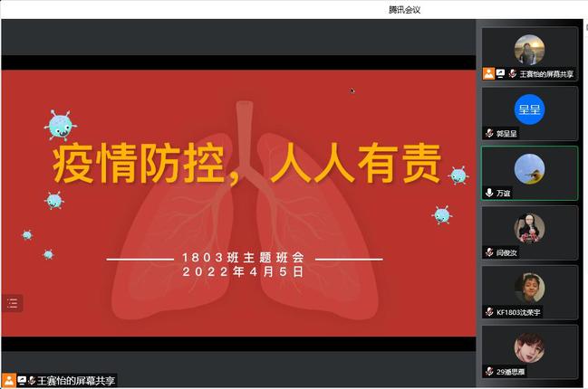 为更好落实学校疫情防控措施,提高学生防护意识,在关键时期织好织牢疫情防控网,教育科学学院各班级于4月5日至6日召开疫情防控主题班会,该院全体学生积极参与。