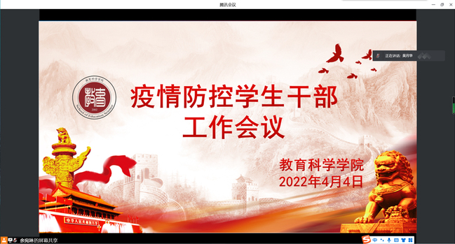 为进一步从严从紧抓好新冠肺炎疫情防控工作,切实保障学校师生的生命安全,教育科学学院于4月4日、5日在线上分别召开疫情防控工作系列会议。本次系列会议,包含班主任工作会议、学生干部工作会议、各年级各班级班会。学院党总支书记吴月华、党总支副书记吴兴、全体班主任老师、辅导员老师出席,全体同学参加。会议围绕对新冠肺炎疫情防控工作进行了再部署,再强调,再落实。