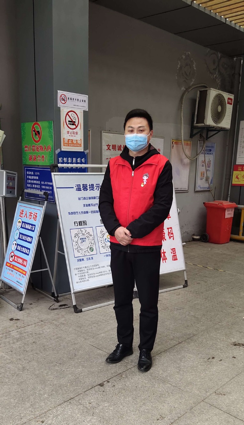 肖源老师是一名有近20年党龄的老党员,他先后前往龙潭街道安佳园社区菜场、康靖花园、禧和苑等小区担任门岗值守志愿者。早上8点,肖源老师穿上红马甲,手持体温枪,熟练地为进入菜场、小区的居民测量体温,查验苏康码和行程码。“您好,请出示苏康码、行程码。”“您是从外地回来的啊,有没有向社区报备。”“请戴好口罩,小孩口罩尤其要戴好。”这是肖源老师一天下来说的最多的话。