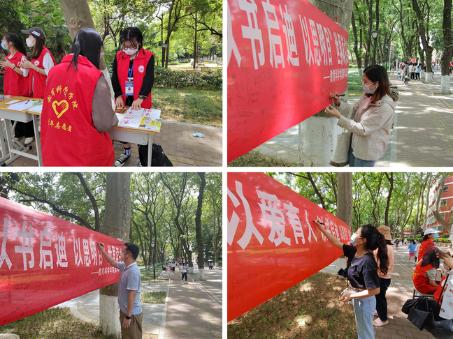 本次活动共分为三个部分:签名领取书签、交换明信片、交换藏书。同学们在横幅上签上自己的名字,写下对读书的认识和见解。横幅上很快就写满了同学们的名字和各类关于读书的名言警句。第二部分,在明信片上写下与读书相关的诗词美句,有的同学写下勤读书籍的古诗自勉,有的摘抄了书中喜爱的佳句分享,有的则绘制一幅简笔画,表达对知识的渴求和沉浸于读书的喜悦与满足。隽秀的字体,华美的语句,吸引着过路同学们的目光。第三部分,准备书籍的同学们进行图书交换登记,用自己已有的书籍换取他人的藏书,既分享了读书的感悟,也满足了新知的获取。
