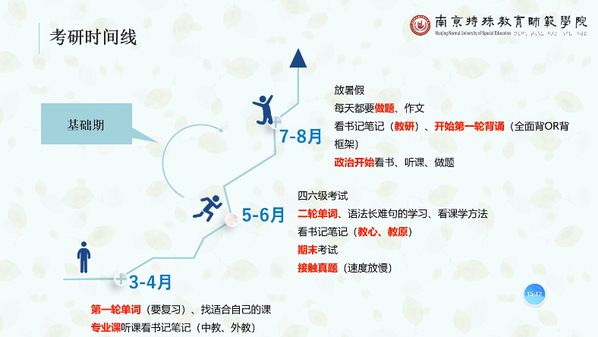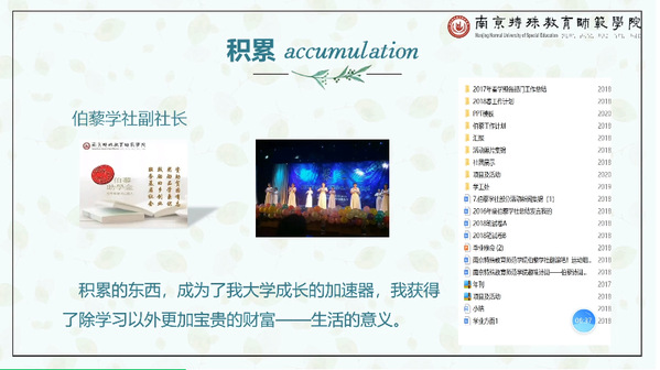 做有梦想的积极行动者。王昕媛同学首先以自己经历的“三座大山”展开分享宝贵经验。进入南京特殊教育师范学院求学、加入伯藜学社、决定考研是她在大学里所面临的“三座大山,”尝试、调整、积累是她开始蜕变提升自己的最优方式。她就大学学习生活、考研学习方法及读研后的感受进行了详细的阐述,很多的第一次让她为后面的路打下基础,专业课排名第一、成为伯藜学社副社长、考研成功等。从她的经验分享中,可以看到自信、努力、坚持是她翻越“三座大山”的秘诀。