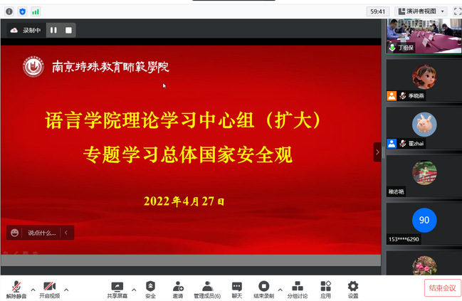 4月27日上午,语言学院理论学习中心组召开学习会,专题学习总体国家安全观,会议由学院党总支副书记丁祖保主持,执行院长王东领学。语言学院理论学习中心组成员及全体行政人员参加,第五轮校内巡察工作第一巡察组副组长、巡察组成员列席会议。