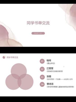 钱纯等5位同学代表读书小组分享近期的阅读书目及心得。秦奕老师肯定本次活动,指出卓越班同学需要从专业阅读中点燃智慧火花,并结合曾诗洁同学分享的《学前特殊需要儿童融合教育实用手册》分享了自己的阅读经历,提出同学们可以花更多的时间去共读一本书,希望在下一次的读书会能够提出更多独立的思考与想法。