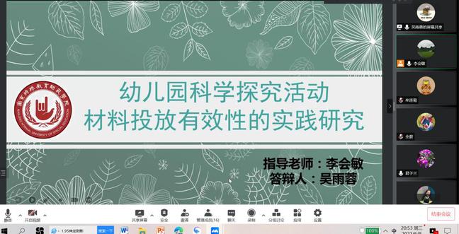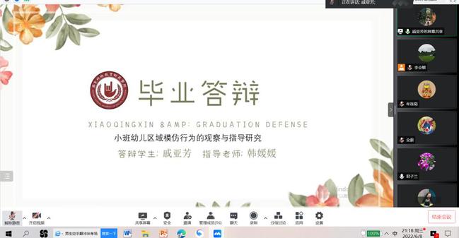 毕业论文是人才培养的重要环节,也是对学生专业知识、综合运用能力的全面检验。为确保学院2020级学前教育本科函授班人才培养的质量,结合我校继续教育学院的相关规定,学院于2022年6月8日晚,开展了成人高等学历教育函授本科毕业论文线上答辩。学院教师张兰香、李会敏、韩媛媛、牟连菊参加了本次答辩工作。