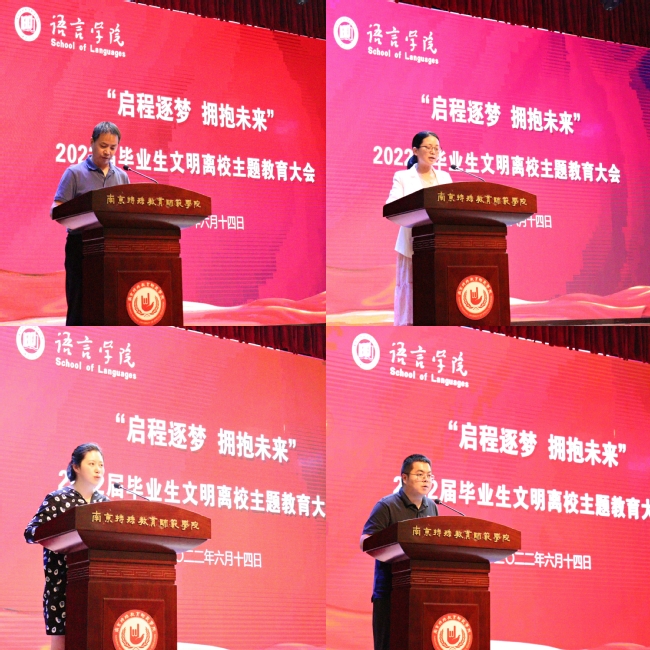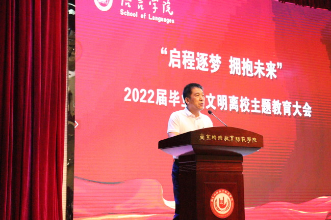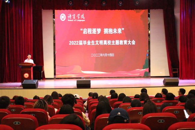 为确保语言学院2022届毕业生离校工作安全、稳定、文明、有序,助力毕业生踏上人生新征程。6月14日下午,语言学院召开“启程逐梦 拥抱未来”2022届毕业生文明离校主题教育大会。学院党政班子全体成员、毕业班班主任、教研室主任、党支部书记、全体辅导员和毕业生参加会议。会议由学院党总支副书记谢军主持。