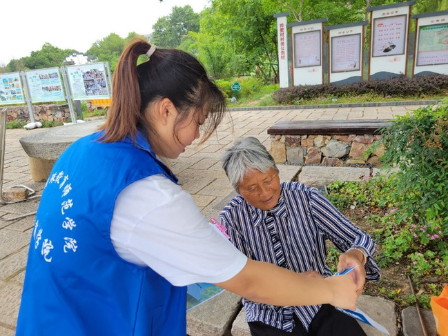 团队成员共分为三组,志愿者们手持垃圾分类的宣传页和问卷,分别前往桦墅村不同位置对村民与游客进行垃圾分类的有关知识的宣讲与调研。