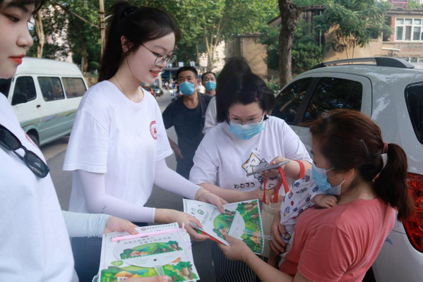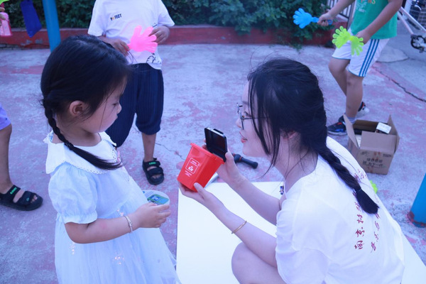 长夏炎热,天气郁蒸,却难以盖过成员们洋溢的热情。下午2时,团队成员来到化纤新村社区,通过传单发放、歌曲演唱的方式开展了“垃圾分类“主题宣讲活动,并且分别邀请社区各年龄段的居民结对开展主题活动,从孩童到老人,居民们在欢声笑语中了解垃圾分类的相关知识,感受垃圾分类的重要性。