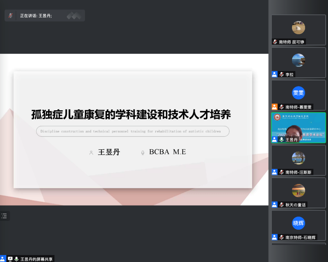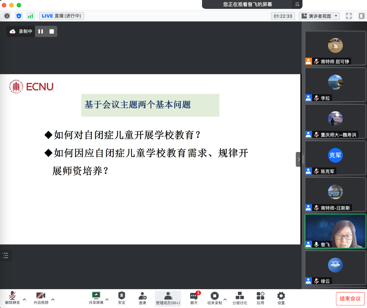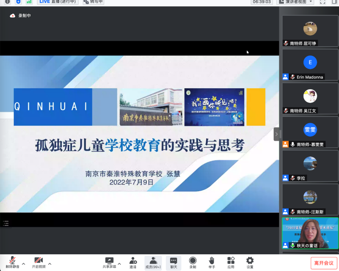 2022年7月9日,我校孤独症教育研究中心举办了“首届孤独症教育学术论坛”,邀请了来自浙江工业大学、华东师范大学、北京师范大学、重庆师范大学、香港地区、美国的知名专家学者以及基层学校的校长与教科研负责人,共10余名国内外顶尖的孤独症教育领域专家,共聚云端,围绕孤独症儿童教育与师资培养的主题展开研讨。线上参会人员突破六百余人,反响热烈。
