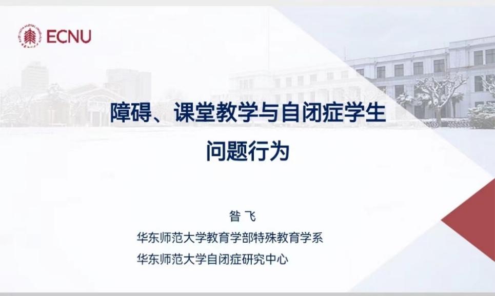华东师范大学昝飞教授报告的题目是“障碍、课堂教学与自闭症学生问题行为”。昝教授提出了关于“孤独症儿童学校教育与干预的不同”的话题,在学校情境下应当思考的是如何在集体教学情境、在功能教室或资源教室的小组教学中,更好地满足孤独症儿童个别化的教育需求。