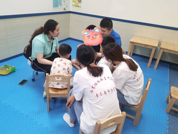 在社交沟通训练中,老师带领孩子们做了律动,玩了乐器。随后带他们玩了捡积木的游戏,让每一个孩子都当了两次小裁判的机会,通过游戏体验,教会他们记住先后、输赢的区别。紧接着,团队成员们也在和孩子们一起游戏的同时,与他们建立了初步联系。随后,又一起玩了跳圈圈的游戏,在音乐停下后,和好朋友一同跳进选定颜色的圈内。通过各种游戏的方式,引导孩子们主动社交,增强他们社会交往的能力。