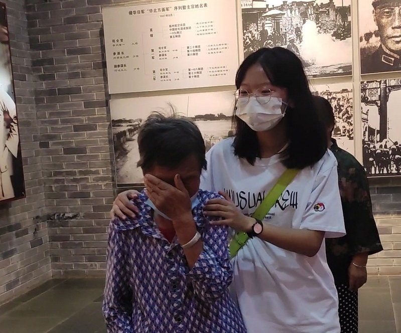 7月29日,团队成员刘雨菲陪着88岁高龄的刘秋云奶奶走进平型关大捷纪念馆参观。刘秋云4岁时,她的父母就被日本人残忍杀害,后被好心人收养才躲过一劫。团队成员了解到刘秋云奶奶不识字而且有听力障碍,便提前学习了平型关大捷历史的相关手语。在主题馆中,刘秋云奶奶看着一幅幅革命烈士的画像,看着志愿者用手语讲述的烈士们的英勇事迹,不由得回想起自己小时候遭受的苦难,眼泪止不住地流。“没有他们的流血牺牲,就没有我们现在的幸福生活,不能忘了他们。”刘奶奶说道。