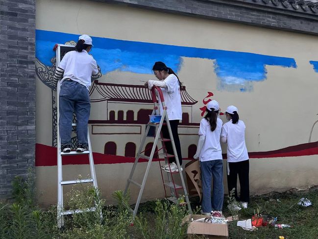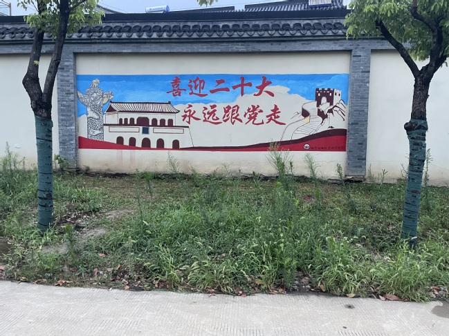 从讨论图案到绘制草图,从调色到上色,同学们相互合作、配合默契,每一帧画面都倾注了同学们的心血。他们以颜料为载体,以画笔为工具,不仅美化乡村环境,而且呼吁村民关注党的二十大的召开,体现了南特师学子吃苦耐劳的宝贵品质和坚定决心跟党走、努力奋进新征程的使命担当。