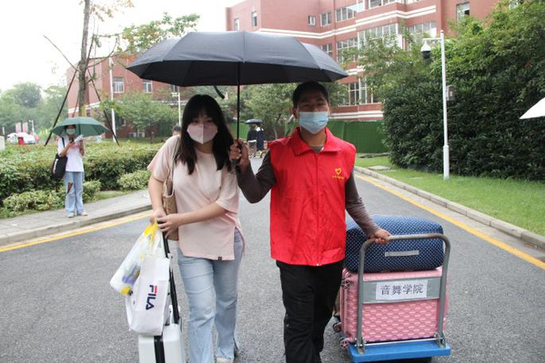 秋风送爽,我校音乐与舞蹈学院迎来2205专转本班新生。8月31日上午,迎新工作开始,志愿者们负责检查新生报到所需的录取通知书、身份证、毕业证书、健康申报表、个人防疫行程卡,以及收取档案及团关系材料。本次迎新工作按照学校疫情防控要求部署,迎新老师有条不紊地开展迎新工作,志愿者们负责引导接待、防疫检查、行李转运等服务工作。迎新服务工作共设置4个岗位。学校南三门设立新生入校报道岗,志愿者与老师负责将新生引导至接待岗和引导岗,并协助进行核酸检测工作,老师带领新生签字报道后,送学生前往宿舍。