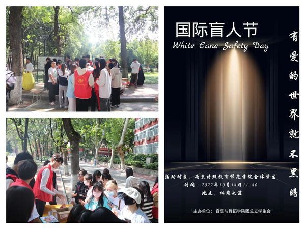 2022年10月15日是第38届国际盲人节,为了让同学们更好了解盲人,营造关心、理解盲人的浓厚氛围,音乐与舞蹈学院于2022年10月14日中午在林荫大道举行“国际盲人节--有爱的世界就不黑暗”主题活动。