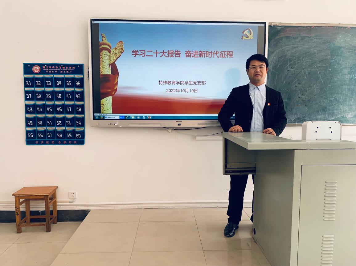为深入学习贯彻党的二十大报告,进一步加强党组织建设、提高党员的思想政治觉悟,特殊教育学院学生党支部于10月19日下午召开“学习二十大报告 奋进新时代征程”主题党日活动。本次活动由学生党支部书记邓露老师主持,特殊教育学院党总支副书记李鹏及支部全体党员参加。