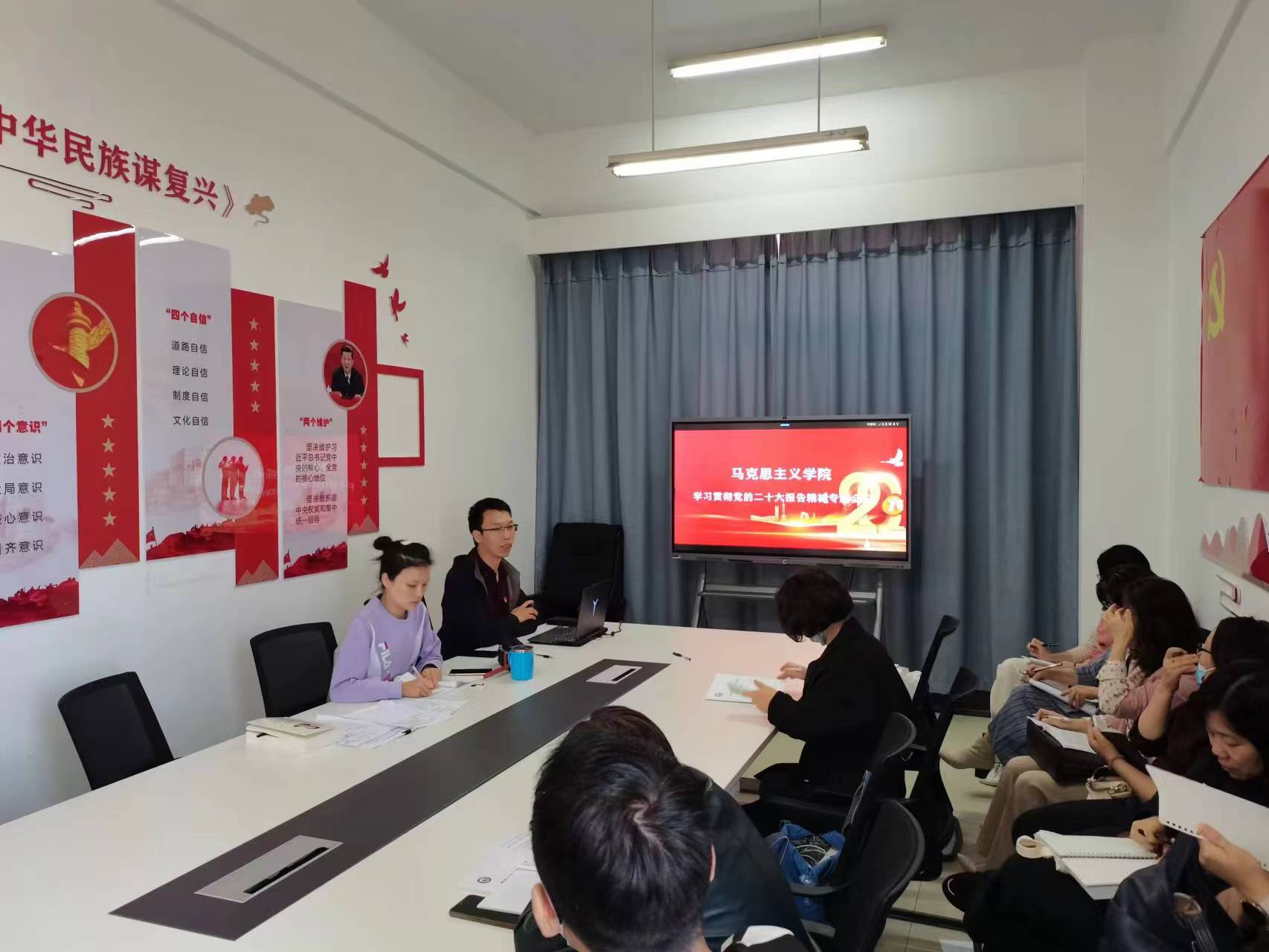 副院长荣霞指出,马院教师要争做先进,要率先学习、主动领会、准确理解、宣传阐释党的二十大精神,用中国共产党的创新理论武装师生头脑、指导育人实践,为全面建设社会主义现代化国家培养有扎实理论基础、有正确政治思维、有远大战略眼光、有勇于创新的实践精神、能担当民族复兴大任的时代新人作出我们应有的贡献。