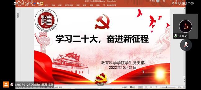 为深入学习贯彻党的二十大精神,引领广大青年矢志不渝听党话、跟党走,始终牢记习近平总书记的谆谆教导,教育科学学院学生党支部于10月31日开展“学习二十大,奋进新征程”专题学习会。会议由学院学生党支部书记汪亮巧主持,学院党总支副书记胡芳、全体辅导员、支部教师党员和全体学生党员参加。