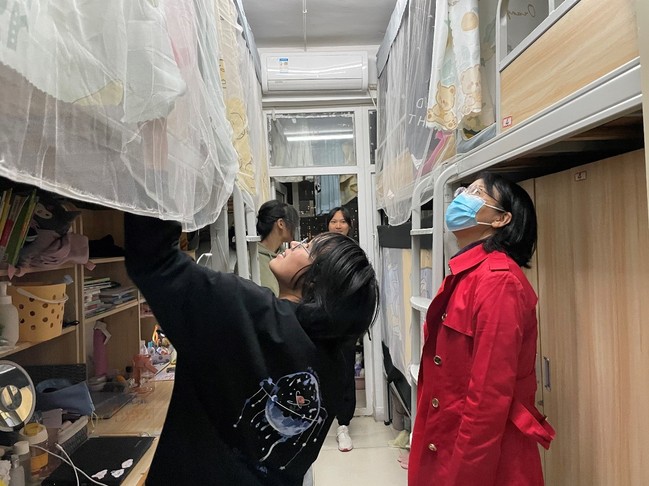 金梅副院长来到学生宿舍,关心询问学生疫情防控期间的线上学习、体育锻炼、饮食等情况,叮嘱学生特殊时期也要上好网课,加强时间管理,养成良好的学习习惯和生活作息。同学们纷纷表示会合理规划好在校期间的学习与生活,活动时会做好自我防护,加强体育锻炼,保持良好心态,严格遵守学校各项管理规定。