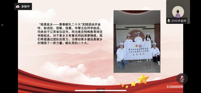 活动伊始,各团队一一汇报暑期实践活动的情况。其中,“乡守以墨”实践团队负责人赖正豪为大家展示了实践活动过程以及实践成果。“乡守以墨”实践团依托学前教育的专业和技能优势,奔赴如皋市东陈镇汤湾村开展乡村墙绘和关爱儿童的活动,四幅墙绘美化了乡村环境,队员们在村委爱心书屋进行宣讲,弘扬了了南京特师“博爱塑魂”的校训精神,充分展现了新时代青年的社会责任感和时代担当。“博爱支教行,情守村童心”实践团的主讲人黄琳讲述了实践团队充足准备,赶赴乡村支教为孩子们献上精彩的课程,团队十分关注特殊儿童,与孩子们共同创作的绘画《缤纷夏日》,颜色明快,鼓舞人心。他们筑梦特殊儿童的未来,也在炎炎夏日实现着自己的缤纷青春。