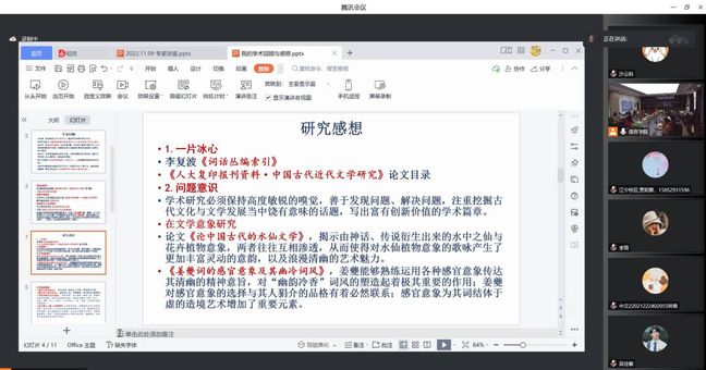 语言学院执行院长王东教授主持并致欢迎词,介绍了高峰教授的主要成就和荣誉。高峰教授在报告中,分享了他自己从现代文学到古代文学,师从朱晓进教授、张中教授到钟振振教授的求学经历,肯定了哲学、文艺理论素养的基础作用,其优秀的本科论文、硕士论文为其学术道路奠定了良好基础,这对在场的老师和同学都有很大启发。同时,高峰教授也传达了治学的严谨态度和吃苦耐劳的精神,表示要有追踪学术前沿和学术动态的科学方法。所有这些都因为热爱学术的“一片冰心”所在。