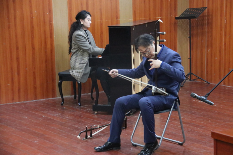 召唤教授还亲自为大家演奏了几首二胡名曲,令在场师生如痴如醉。开场的《苏南小曲》充分体现了中国南方文化所特有的小巧玲珑。他将音域的变化和转调巧妙地组合在一起,使整个演奏始终处于精巧伶俐的表演气氛。《江南春色》把人们带到了优美如画的江南水乡,静谧而令人陶醉。全曲的主题音乐、旋律秀丽柔美,充满了春天的气息,表现了人们内心的喜悦。而《二泉映月》则表现出二胡无限的温柔与凄苦。召唤教授的琴声似水,如同从斑驳的树影中涌出,前尘、往事洒落一地。接着,他又为大家带来了《姑苏春晓》,乐曲描绘了姑苏城早春时分的自然景象,欢快悠扬,甜美抒情,使人仿佛置身于幽曲明净、精巧秀丽的姑苏园林之中。曲目《如来藏》通过音符的跳跃、旋律的流动、节奏的变化与强弱的起伏,表现了其时代性、主旋律以及对人生的探索。