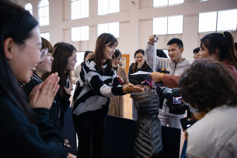 游戏活动环节分为“我拍的最美”“垒球小能手”“爱的抱抱”以及“拔腰旗”四个部分。通过各个场所的打卡游戏,师生们了解了浦口校区美丽的环境。在“垒球小能手”环节,小组成员集思广益,通力合作,为了让垒的球更高,他们或用网兜,或用鞋子,或用衣服来固定球体,其中一组把球塞进羽绒服立在地上,引来在场观众的阵阵赞叹。