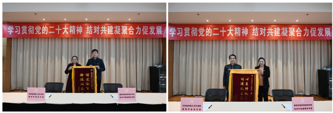 体育学院副院长仝伟代表学院全体师生向文体中心赠送了锦旗,张启昕书记代表直属党支部向文体中心党支部赠送锦旗,双方党组织负责人签署了结对共建协议书。