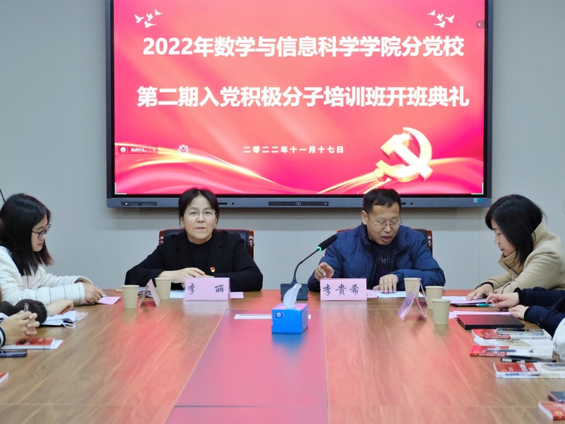 2022年11月17日,数学与信息科学学院2022年第二期分党校开班典礼在博雅楼3601举行。校党委常委、组织部部长、党校常务副校长李丽出席典礼并讲话。开班典礼由数学与信息科学学院党总支书记李贵希主持,数学与信息科学学院党总支副书记丁雯、分党校特聘教师代表李卫娟、本期分党校班主任李唐萌及全体分党校学员参会。
