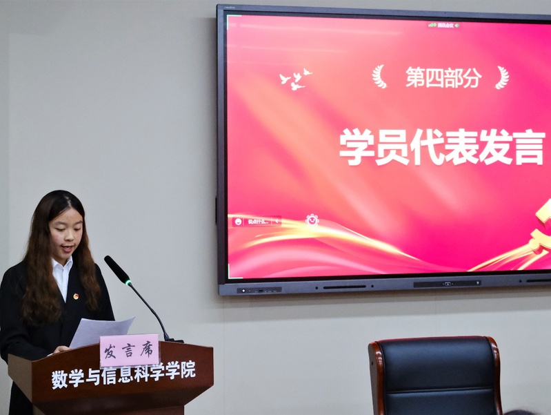 数信2103班孔佳同学代表全体学员发言。她表示,要认真学习党的二十大报告的内容和精神,不断提高思想道德修养,以党员的标准要求自己,把自己塑造成为一个有理想、有抱负、有文化、有思想的“四有”新人。