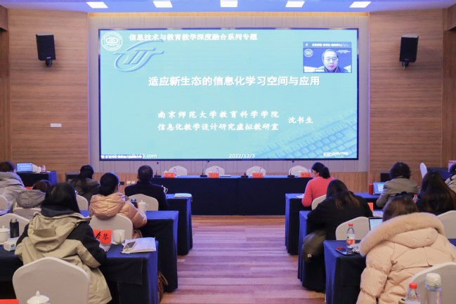 本次培训聚焦教学能力提升,其中南京师范大学沈书生教授做了题为《适应新生态的信息化学习空间与应用》的讲座。随着课程信息化、教学环境信息化的逐步实现,今后的教学将会受到丰富的媒体与人力的支持,教与学的方式可以有更多的选择,教师必须加强自主自觉运用信息的意识,以适应未来发展的需要。沈书生教授围绕“智慧时代的教育新生态”“信息化推进的变革特征”“学习空间的内涵与应用”几个方面,深入浅出地对相关概念进行剖析,并在此基础上对各位老师未来如何成为一名当代合格的新型教师提出了相关建议。