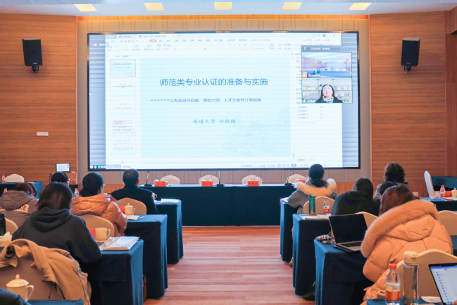 为迎接本科教学工作合格评估和师范类专业认证工作,本次培训也邀请了南通大学的许铁梅教授做了题为《师范类专业认证的准备与实施》的讲座。许铁梅教授从专业自评自建、课程大纲、人才方案修订等视角,紧紧围绕师范专业认证的逻辑与专业建设、师范专业认证的申报、自评与进校考察等几个主题,从时代背景、认证理念、基本逻辑等进行了分析与探讨,图文并茂,条理清晰。所有参培人员认真倾听,深入体会,受益匪浅。