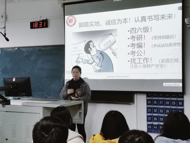 会上,郑丹丹老师从“诚信为本、书写未来”谈考风考纪,提醒考研学生关键阶段坚持到底,考编学生多尝试也要理性;从安全角度,提醒毕业生在网络上要保持头脑清醒、谨言慎行。寒假离校前做好宿舍断水断电,另外也要注意防疫安全、人身安全、求职安全,谨防求职诈骗。接着,将学校最新进出校门流程和离校手续逐一讲解。最后,简要介绍了毕业基本条件、档案管理与投递等毕业事项,让毕业生能够正确处理毕业和就业的关系,努力做到毕业和求职两不误,克服求职备考压力,保持积极健康的心理状态。