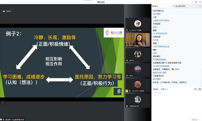 高羽烨老师首先由“情绪是什么”的问题引入话题,指出积极情绪和消极情绪的内涵,以及它们具体的表现,让同学们发散思维,举出相对应的情绪案例,参与到活动中来。同时高羽烨老师以“学习困难,成绩退步”为例,过渡到情绪、行为和认知三者的关系,让同学们由产生的消极或积极的情绪行为表达出自己的感受和想法。