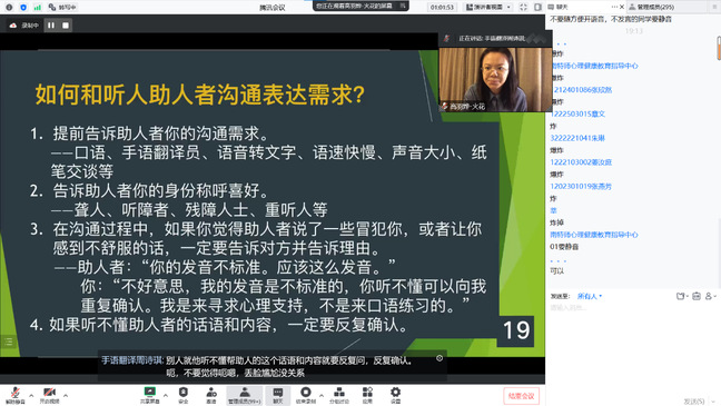 针对融合学生“如何和听人助人者沟通表达需求”的问题,她指出需要提前诉说自己的需求;告诉自己的身份称呼和喜好;准确表达自己的不舒服和理由;听不懂时要反复确认的四个方法,帮助融合学生有效解决相应困难。