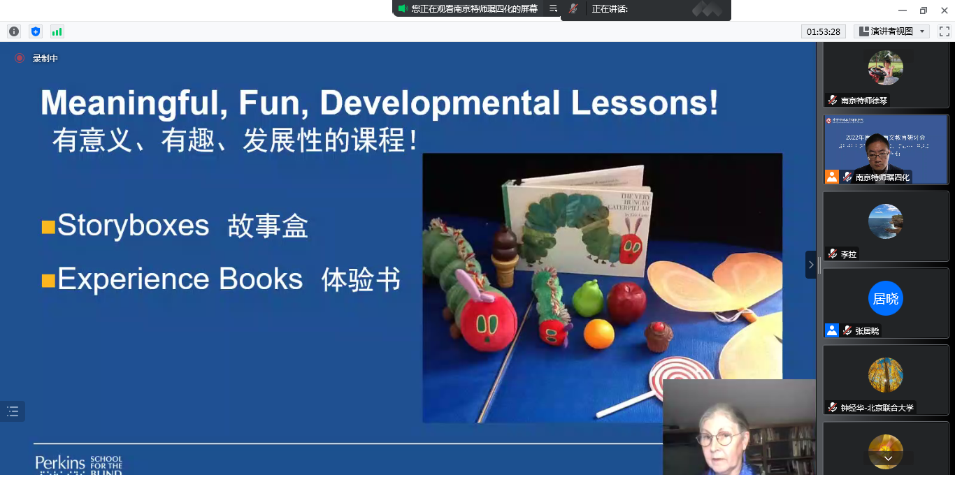 美国帕金斯盲校国际项目亚太区主任黛博拉·格里森以故事盒和体验书发展盲文读写能力为例,分享了盲多重障碍儿童盲文教学的有效经验。