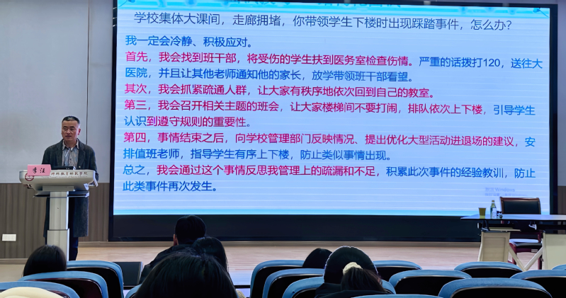 “当遇到两难的问题不好作答时,这不仅在考察你的知识,还在测试你对自己情绪的把控和认知的高度,看你是否以学生为主体并遵循了立德树人的标准,这个时候就更需要用自信、平和的心态阐述你的观点。”为进一步加强同学们的认识,李汪副校长通过具体实例,从作答思路与作答原则两个维度出发,分析了答题过程中始终要有“提出问题、分析问题、解决问题、复盘问题”思路的重要性。经过生动具体的剖析,同学们对教师资格证面试的认识逐渐明晰。他提醒同学们,在面试时要做到教态大方、衣着得体、表达流畅、举止自然,以饱满自信的姿态展示师范生素养。