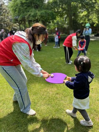 在“运输蛋宝宝”环节,志愿者与孩子们一起将道具“蛋宝宝”运输一个来回。整个环节需要志愿者配合小朋友弯腰前行,在运输过程中不仅要保障孩子的安全,还要与孩子一起保护好“蛋宝宝”。志愿者们在活动中与小朋友团结协作、耐心沟通、细心配合,完美地完成了这项趣味运动。
